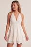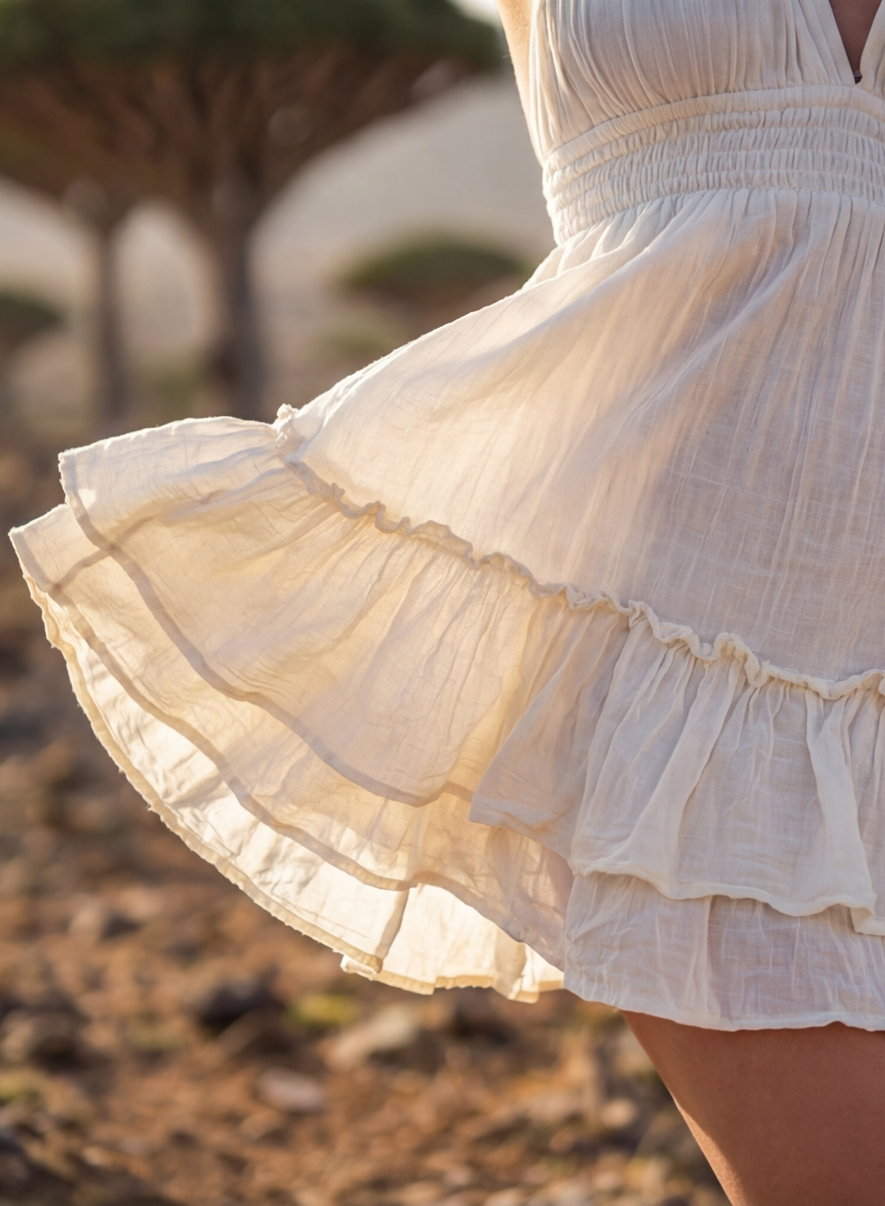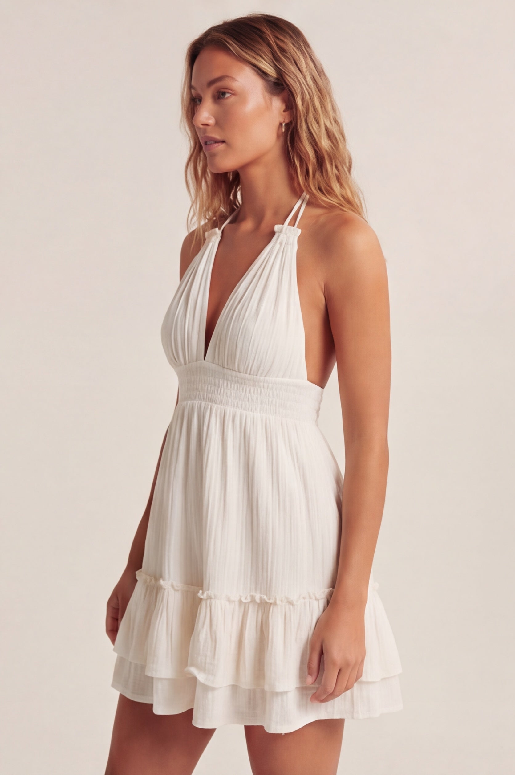 A soft ivory dress that moves with you. The halter neckline frames the shoulders, with adjustable straps that tie and adapt—always just right. The gathered bust falls into a fluid silhouette. The waist is gently defined—elastic, effortless.